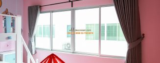 ภาพรวมหลังจากติดผ้าม่านตาไก่แบบทึบมุมประตู และมุมหน้าต่าง 2 ข้าง ติดด้วยม่านพับ ที่มีวดลายเดียวกัน