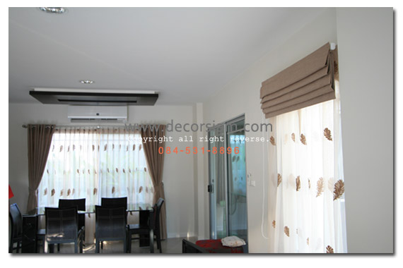 มุมชั้นหนึ่ง ฝั่งโต๊ะกินข้าวที่ตกแต่งหน้าต่างด้วย ผ้าม่านตาไก่ แบบทึบ และแบบโปร่ง เพื่อป้องกันแสงเข้าภายในตัวบ้าน