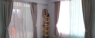 ตกแต่งผ้าม่านจีบ แบบทึบ สีเทา สามารถป้องกันแสง และกัน UV ได้อย่างดี พร้อมด้วยติดตั้งผ้าโปร่ง สีขาว เพื่อช่วยกรองแสง จากด้านนอก