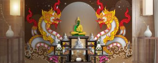 แต่งห้องพระด้วยวอลเปเปอร์ลายไทยพระแม่ธรณีพื้นหลังพื้นสีเขียว ลวดลายประณีตสวยงาม