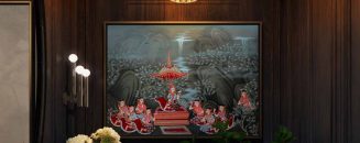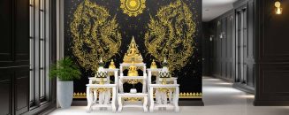 ตัวอย่างการตกแต่งห้องพระด้วยววอลเปเปอร์ลิขสิทธิ์ลายดอกบัวลายเส้นสีทอง พื้นหลังมีให้เลือกหลากหลายเฉดสี มีการออกแบบดีไซน์ที่แปลกใหม่ทำห้องห้องพระดูไม่น่าเบื่อ