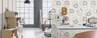 มุมห้องรับแขกที่เลือกใช้วอลเปเปอร์  ลายวงกลมเรียงต่อเส้นตรง สีครีม
