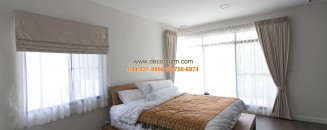 ด้านห้องนอนอีกห้อง ที่ตกแต่งด้วย ม่านพับ ลายทาง สีเทา