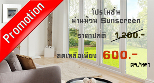 โปรโมชั่น สุดพิเศษ ม่านม้วน Sunscreen สามารถนำไปใช้งาน ติดตั้งบริเวณมุมหน้าต่าง กระจก เพื่อช่วยป้องกันแสงแดด ในราคาสุดพิเศษ จากราคาปกติ 1,200.- ลดเหลือเพียง 600.-/ตร.หลา โดยม่านม้วน Sunscreen