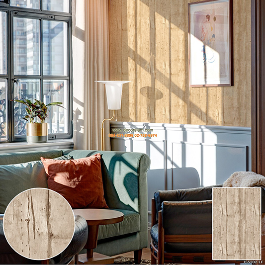 ตัวอย่างห้องนั่งเล่น ตกแต่งด้วย วอลเปเปอร์ ลายแผ่นไม้ สีครีม รหัสสินค้า : JLT12-37